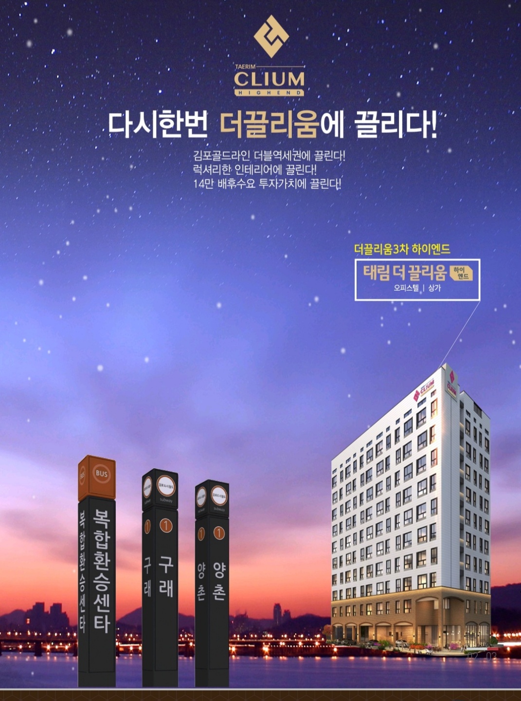 김포 구래에 양촌역, 구래역 사이 더블역세권으로 자리 잡은 태림더끌리움 하이엔드라는 수익형 오피스텔로 아파트 대체 역할을 할 수 있는 아파텔입니다.
