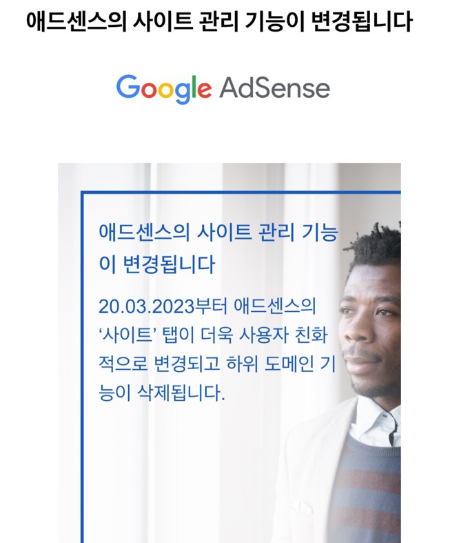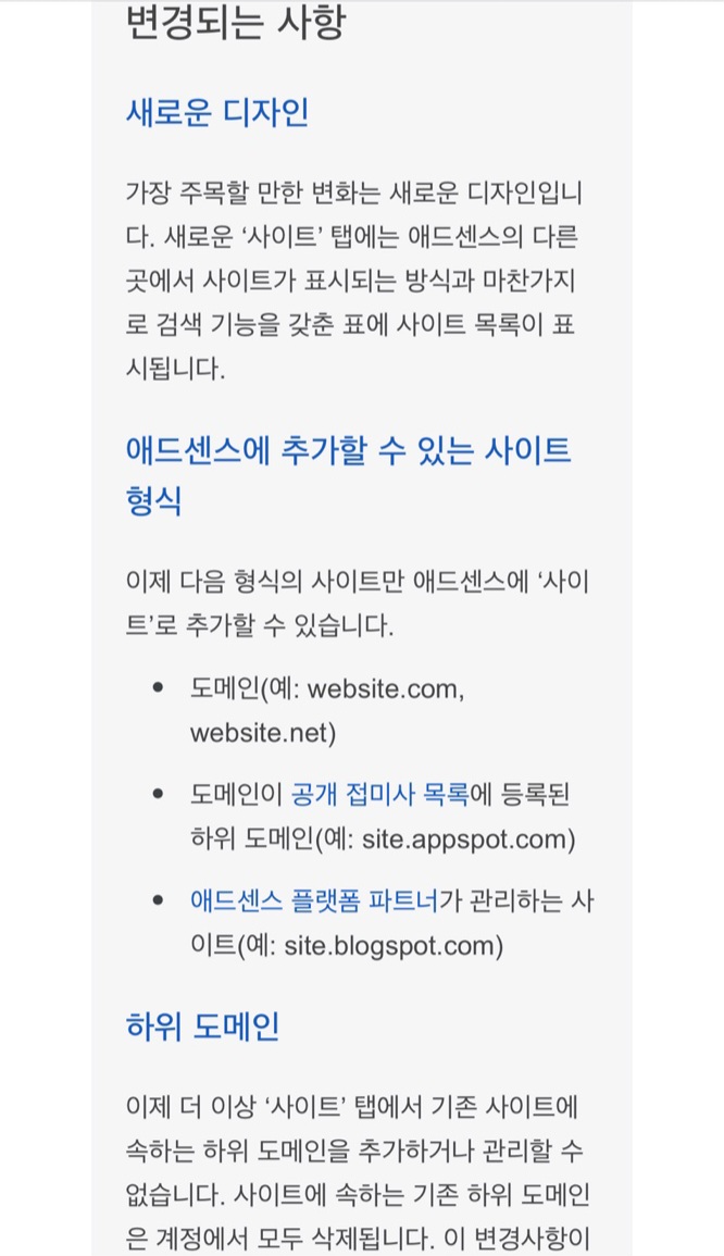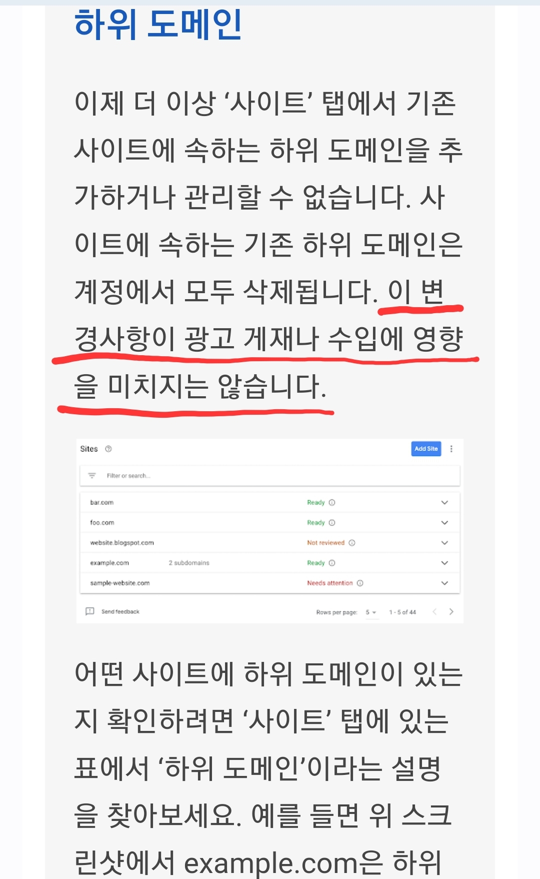 위에서 보는 것과 같이 수익에 지장이 생기지 않는다라는 설명을 보고 다시 메일을 확인해 보니 글이 조금 이상하게 번역된 것일 뿐 앞으로는 좀 더 편리해진다는 내용이었습니다. 이내용을 정리해 보자면 기존에는 애드센스 승인받으면 하위도메인을 별도로 설정해야 했습니다. 하지만 이제는 이런 불편한 과정을 진행하지 않아도. com으로 한 번만 승인을 받으면 자동으로 하위도메인을 인식하겠다는 말입니다.